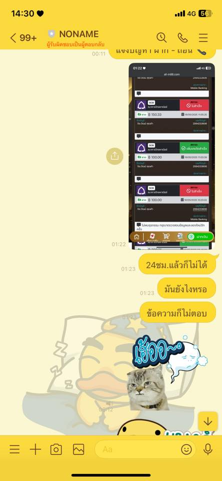 ฝากไม่ได้บอกให้รอ24ชม. นี่ก็เกินไปนานแล้ว ข้อความก็ไม่มีการตอบกลับ