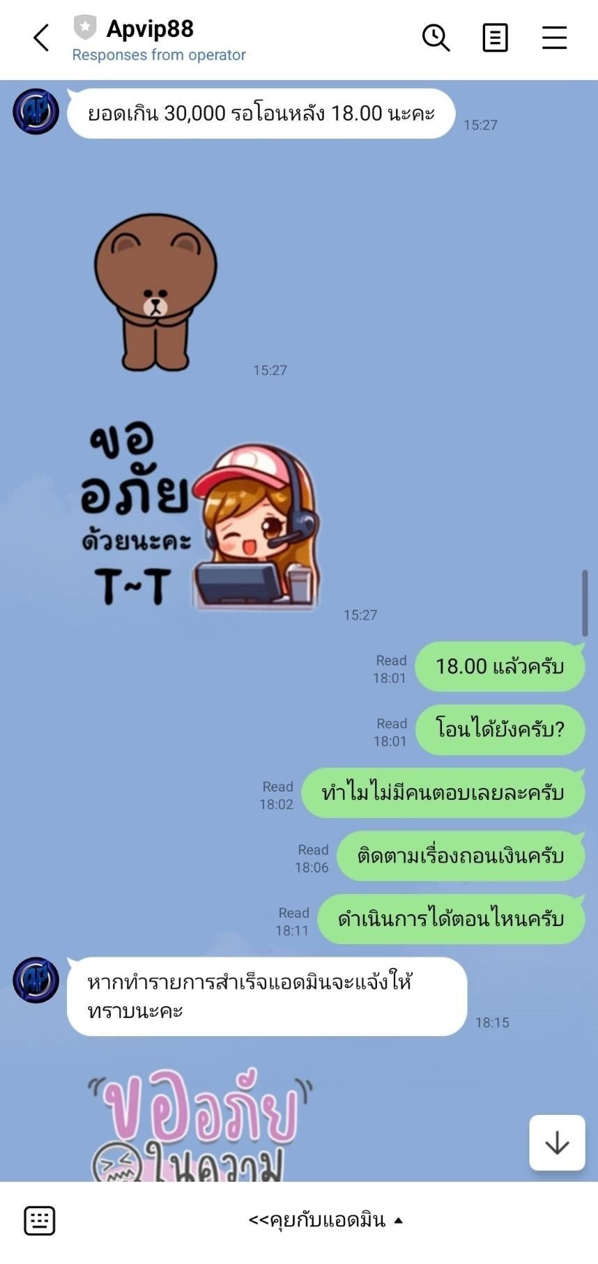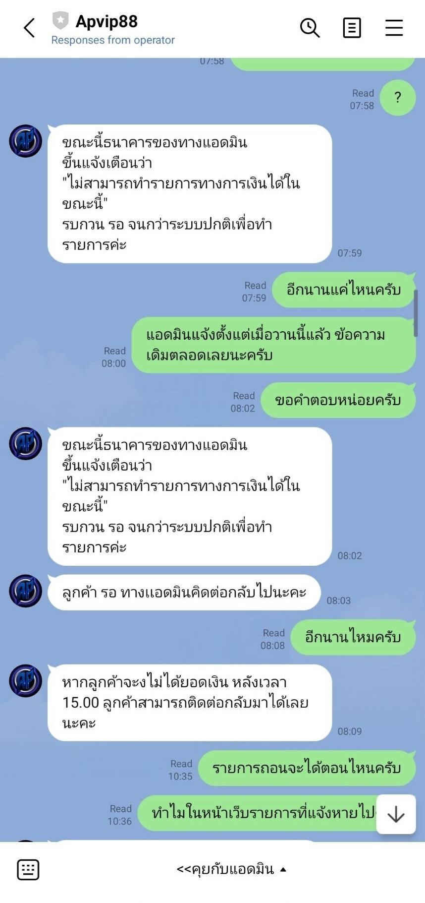 APVIP88 โกง 100,000 ถอนไม่ได้ แอดมินอ้างธนาคารมีปัญหาตลอด พอทวงถามบ่อยๆไม่ยอมตอบไลน์ ล่าสุดเข้าระบบไม่ได้แล้ว