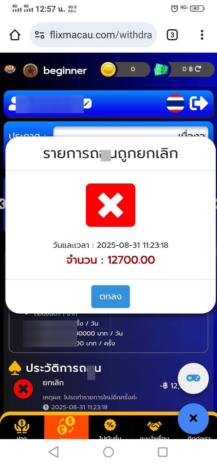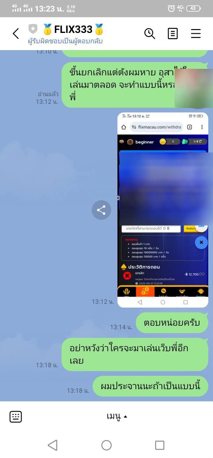 Flix333 โกงยอด12,700 แจ้งถอนแล้วถูกยกเลิกทุกรายการ ติดต่อแอดมินไม่ได้ ไม่มีการตอบกลับ