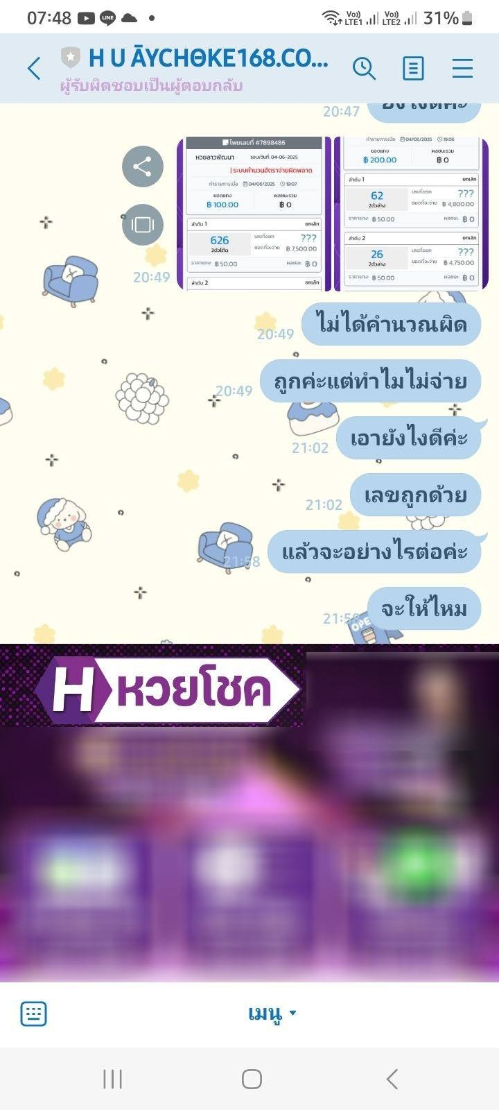 #HUAYCHOKE168 หวยโชค โกง ยอด 60,000 ถูกหวยไม่จ่าย อ้างระบบคำนวณผิดพลาด ยกเลิกโพยหลังหวยออกแถมโดนปิดยูส แอดมินไม่อ่านแชท