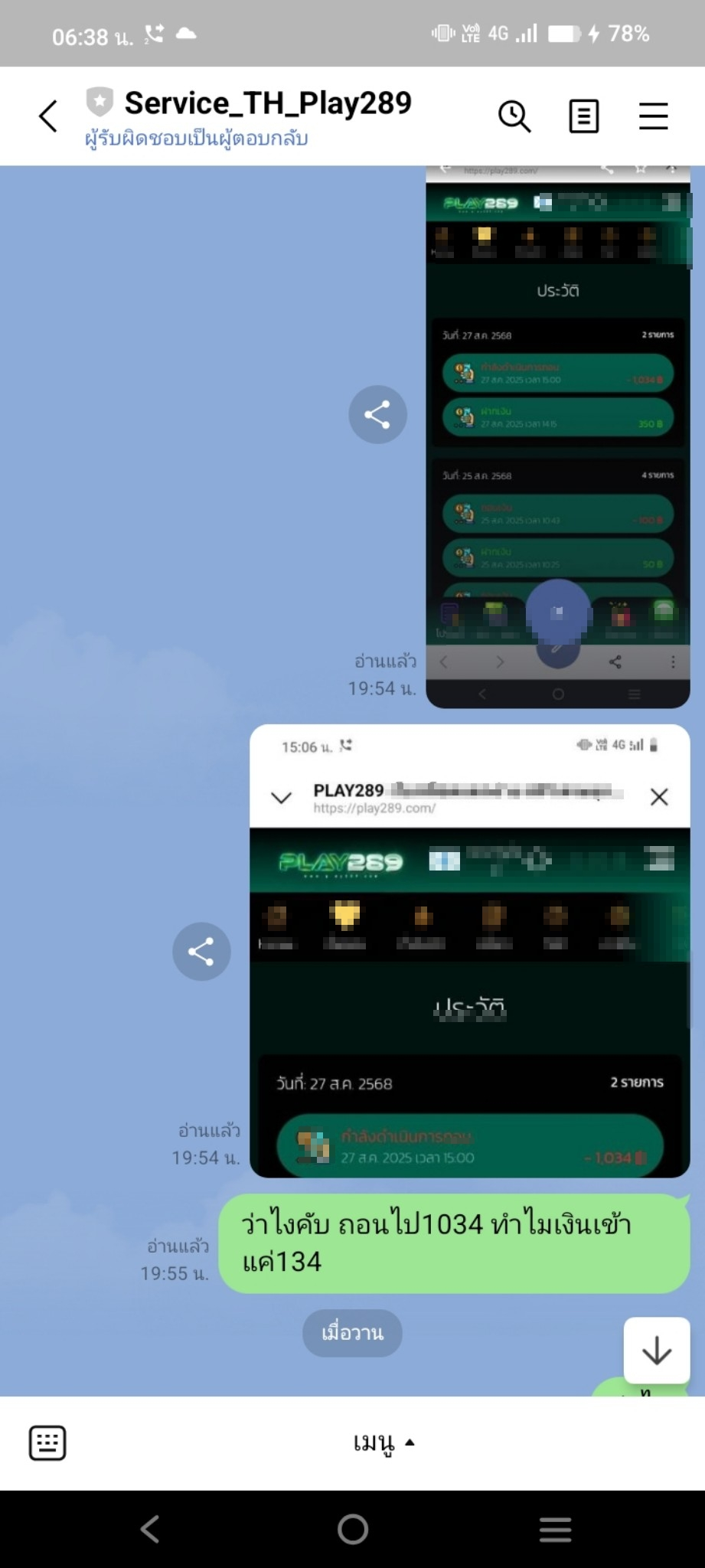 1,034 แจ้งถอนไป เว็บจ่ายมาแค่ 134 ยอดที่เหลือหาย PLAY289