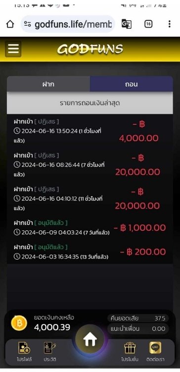 แจ้งถอนเงิน 3,000 แอดมินบอกให้รอยอดเข้า 48ชั่วโมง ถึงตอนนี้ก็รอมา 4วันแล้วยอดยังไม่เข้าค่ะ ฝากเตือนทุกคนที่เล่นอยู่ระวังกันด้วยนะคะ ถ้าไม่อยากโดนโกงห้ามเล่นเว็บนี้